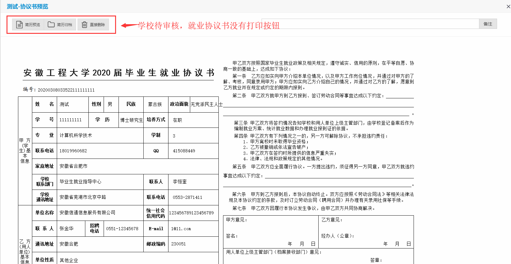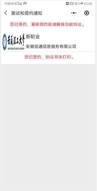 簽約成功后,簽約狀態(tài)為“簽約成功,待學(xué)校審核”,就業(yè)協(xié)議書不能打印。