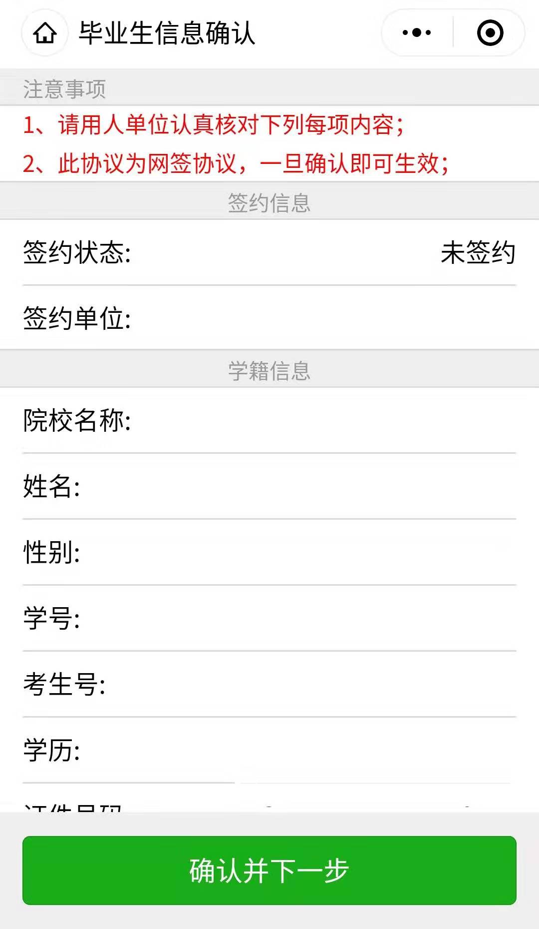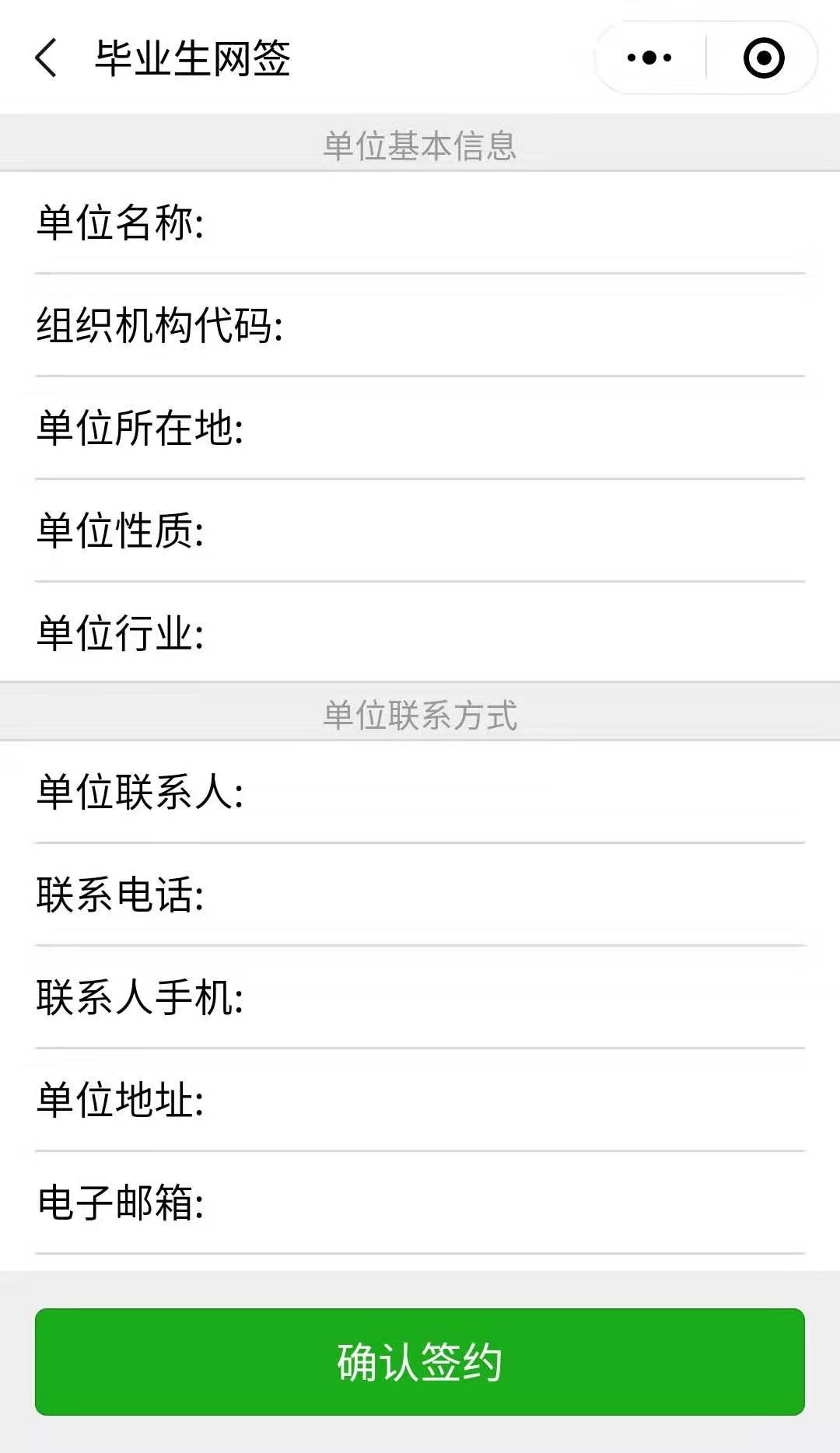 第二步、用人單位打開微信,使用掃一掃功能,掃碼后,會出現(xiàn)填寫簽約信息頁面;用人單位首先驗證畢業(yè)生信息,確認下一步后,填寫本單位基本信息和聯(lián)系方式,并選擇簽約畢業(yè)生的工作崗位,然后點擊“確認簽約”后提交。