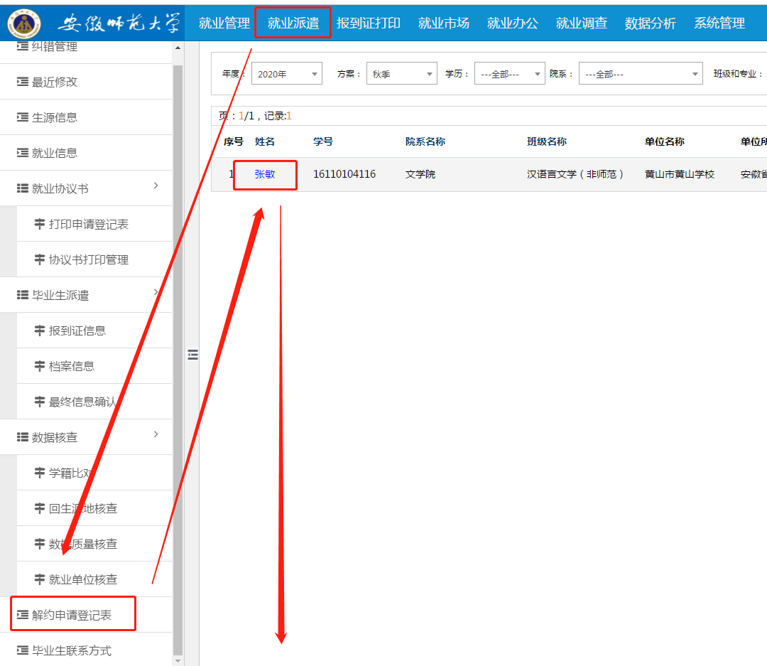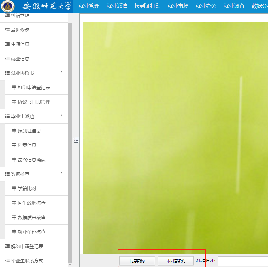 第二步、輔導(dǎo)員進入系統(tǒng),點擊上方“就業(yè)派遣”,再點擊左下角“解約申請登記表”,點擊申請學(xué)生姓名,進入審核頁,點擊“同意毀約”或“不同意毀約”即可。