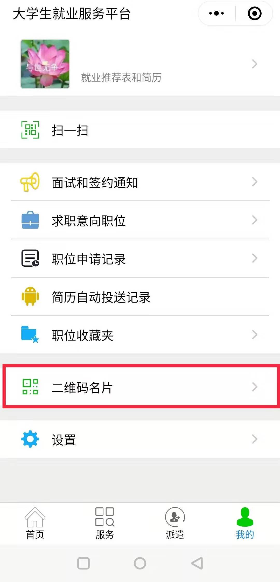 第一步、畢業(yè)生在“我的”中打開“二維碼名片”,向用人單位招聘人員發(fā)送二維碼,并告知使用微信掃描二維碼。