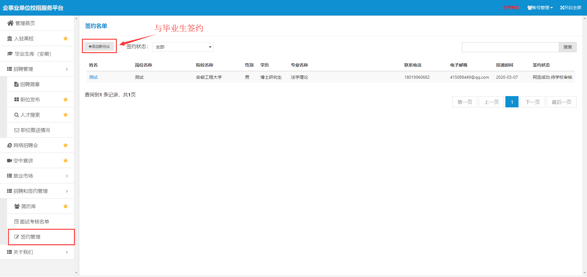 第二步、用人單位打開簽約管理模塊