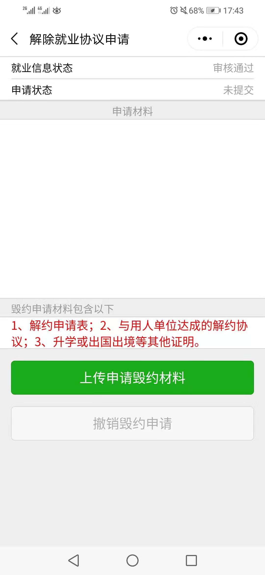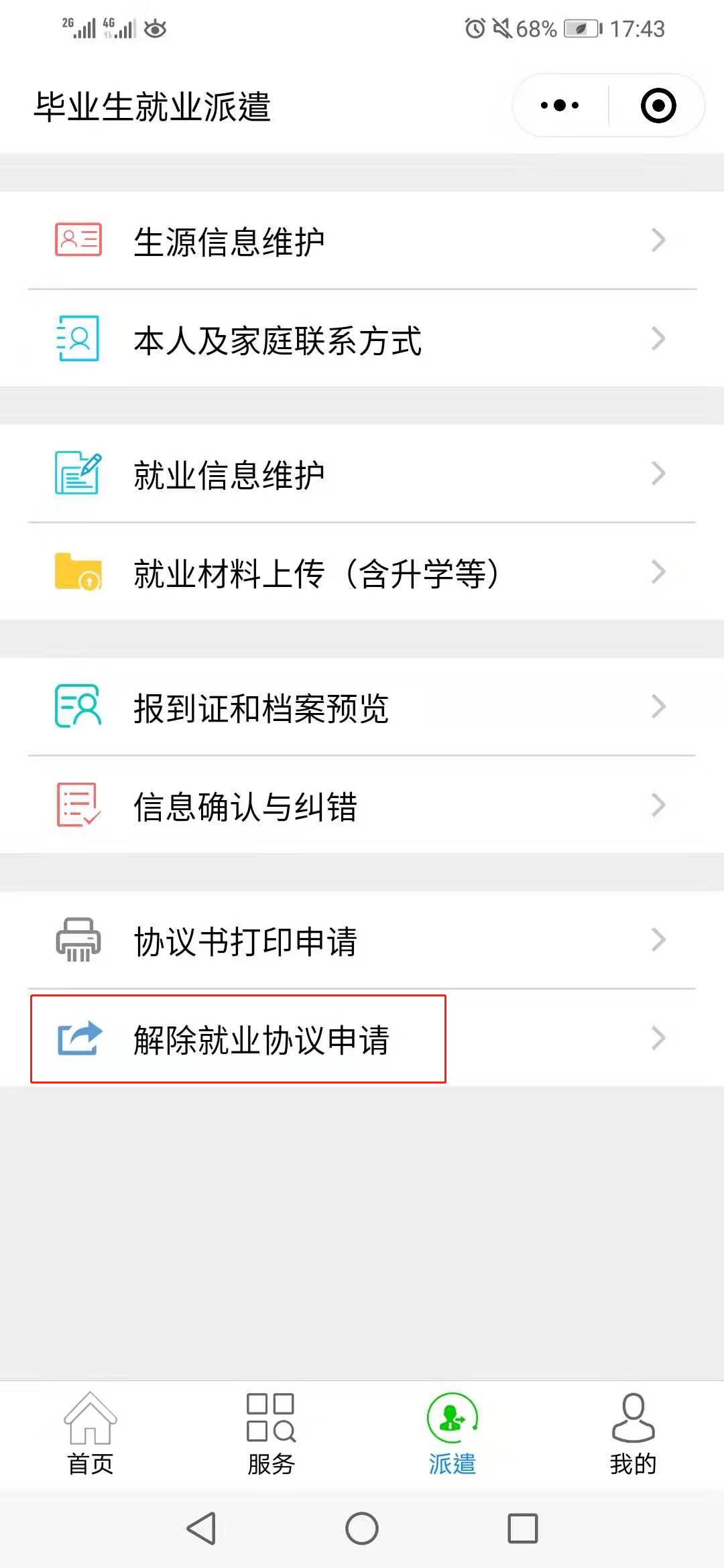 第一步、畢業(yè)生進入微信小程序:安徽省大學(xué)生就業(yè)服務(wù)平臺,點擊“派遣”,進入“解除就業(yè)協(xié)議申請”,上傳解約申請材料。