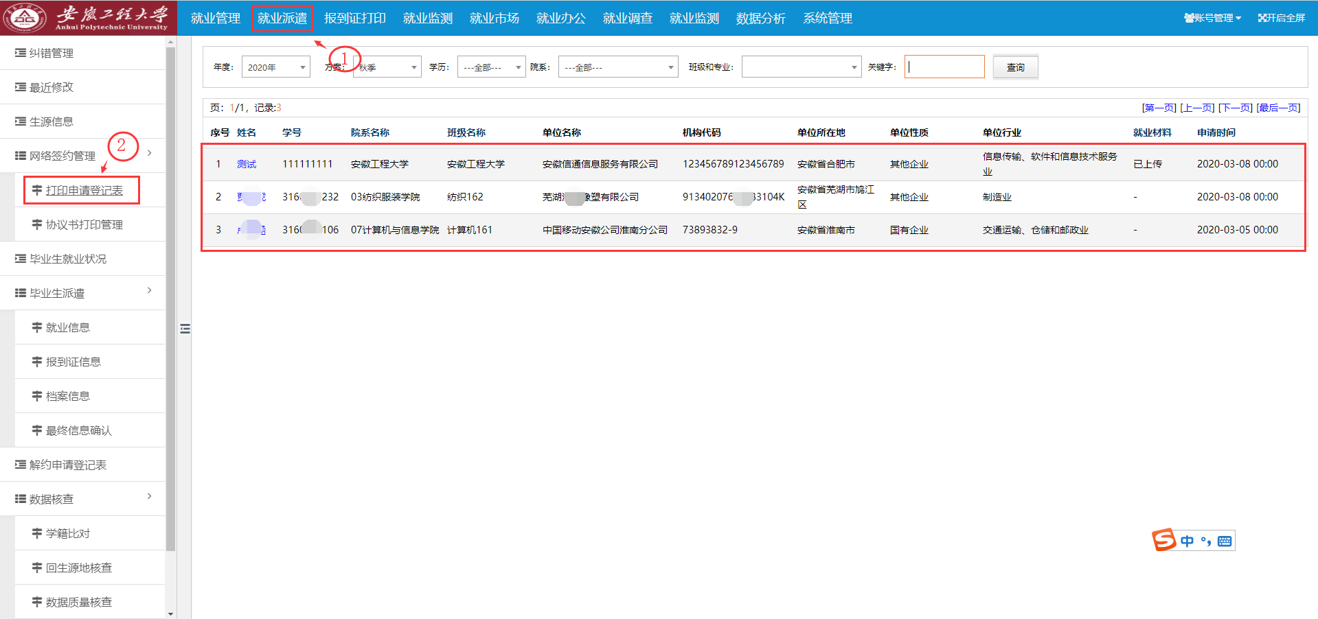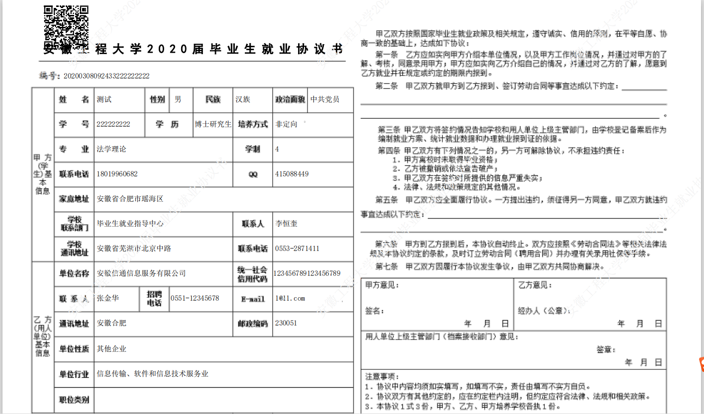協(xié)議書默認打印3份(用人單位1份、畢業(yè)生1份、學(xué)校1份)。協(xié)議書打印完畢后,交給用人單位或畢業(yè)生,進行蓋章簽字后生效。(若畢業(yè)生在外地,可自行安裝一個PDF打印機,打印成PDF文件,以便進行網(wǎng)上傳輸; 或打印出來后,掃描后傳輸)。