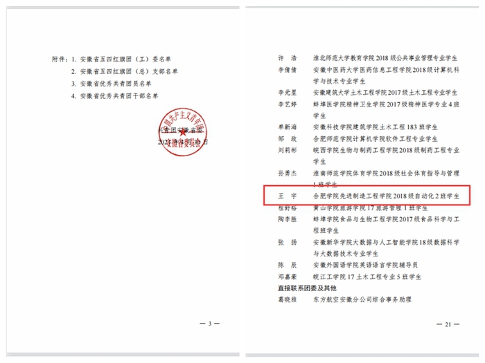 近日,共青團(tuán)安徽省委員會公布2020年度安徽省“兩紅兩優(yōu)”評選表彰結(jié)果,我校先進(jìn)制造工程學(xué)院2018級自動(dòng)化專業(yè)王宇同學(xué)榮獲“安徽省優(yōu)秀共青團(tuán)員”稱號。
