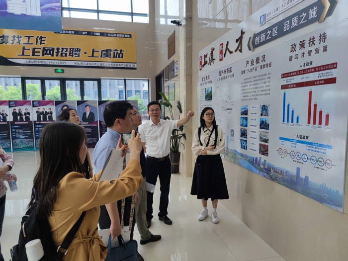接著,調(diào)研組一行參觀調(diào)研了紹興(上虞)人力資源服務(wù)產(chǎn)業(yè)園。接待人員對(duì)產(chǎn)業(yè)園的園區(qū)概況、產(chǎn)業(yè)概況、政策扶持、招聘現(xiàn)場(chǎng)、招聘會(huì)數(shù)據(jù)等方面進(jìn)行了介紹,對(duì)紹興市上虞區(qū)做了區(qū)情簡(jiǎn)介和就業(yè)人才政策解讀,詳細(xì)介紹了上虞區(qū)的人才補(bǔ)助、實(shí)習(xí)補(bǔ)貼、房票補(bǔ)貼等。張應(yīng)杰向上虞區(qū)人社局主要領(lǐng)導(dǎo)介紹了我校的基本情況,強(qiáng)調(diào)了我校應(yīng)用型的辦學(xué)定位和人才培養(yǎng)的特色,希望在前期校地合作的基礎(chǔ)上,持續(xù)推進(jìn)校政企深度對(duì)接合作。