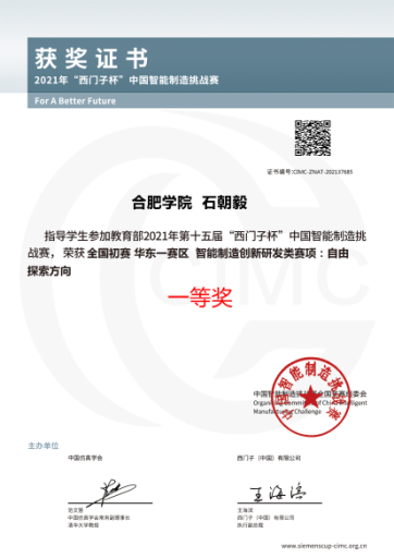 2021年7月20日,教育部第十五屆CIMC “西門子杯”中國(guó)智能制造挑戰(zhàn)賽全國(guó)初賽順利舉辦,通過(guò)線上線下兩種形勢(shì)同期進(jìn)行,于24日圓滿落下帷幕。本屆比賽有來(lái)自全國(guó)近700所高校中的6000支參賽隊(duì)伍,累計(jì)1萬(wàn)余名師生。經(jīng)過(guò)專家網(wǎng)上評(píng)審及線下評(píng)測(cè),最終電子信息工程系有4支隊(duì)伍突出重圍。共獲得全國(guó)初賽 華東一賽區(qū)一等獎(jiǎng)2項(xiàng),二等獎(jiǎng)1項(xiàng),三等獎(jiǎng)1項(xiàng)。沈鳳嬌和張勝老師指導(dǎo)的18級(jí)電子信息工程學(xué)生童子文、吳艷、17級(jí)電子信息學(xué)生丁義組成“油刃有魚”隊(duì)獲得自由探索方向全國(guó)初賽 華東一賽區(qū)一等獎(jiǎng);電子信息工程專業(yè)18級(jí)學(xué)生劉文佳、19級(jí)楊成曉、17級(jí)房晴晴組成的“科技先驅(qū)小隊(duì)”隊(duì)獲得自由探索方向全國(guó)初賽 華東一賽區(qū)二等獎(jiǎng);沈鳳嬌和石朝毅老師指導(dǎo)的18級(jí)電子信息學(xué)生徐梓強(qiáng)、18級(jí)自動(dòng)化學(xué)生趙慧杰和付紫平組成的“Fly”隊(duì)獲得自由探索方向全國(guó)初賽 華東一賽區(qū)一等獎(jiǎng)。沈鳳嬌和張勝老師指導(dǎo)的電子信息工程18級(jí)徐秋洋、19級(jí)朱家樂(lè),自動(dòng)化18級(jí)學(xué)生楊深慧組成的“跡行”隊(duì)獲智能產(chǎn)線與協(xié)作機(jī)器人方向全國(guó)初賽華東一賽區(qū)三等獎(jiǎng)。