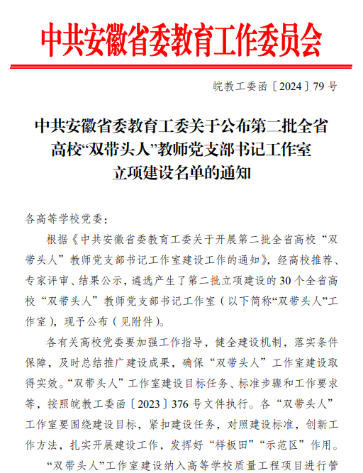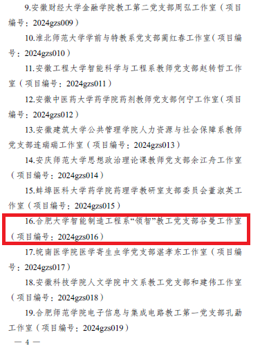 近日,中共安徽省委教育工委印發(fā)《中共安徽省委教育工委關(guān)于公布第二批全省高校“雙帶頭人”教師黨支部書記工作室立項(xiàng)建設(shè)名單的通知》(皖教工委函〔2024〕79號(hào)),合肥大學(xué)先進(jìn)制造工程學(xué)院智能制造工程系“領(lǐng)智”教工黨支部谷曼工作室成功獲評(píng)全省第二批高?!半p帶頭人”教師支部書記工作室。學(xué)院基層黨建工作再創(chuàng)新佳績(jī)。