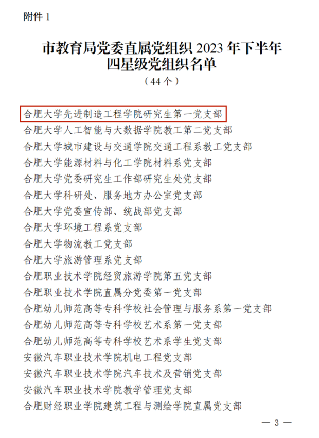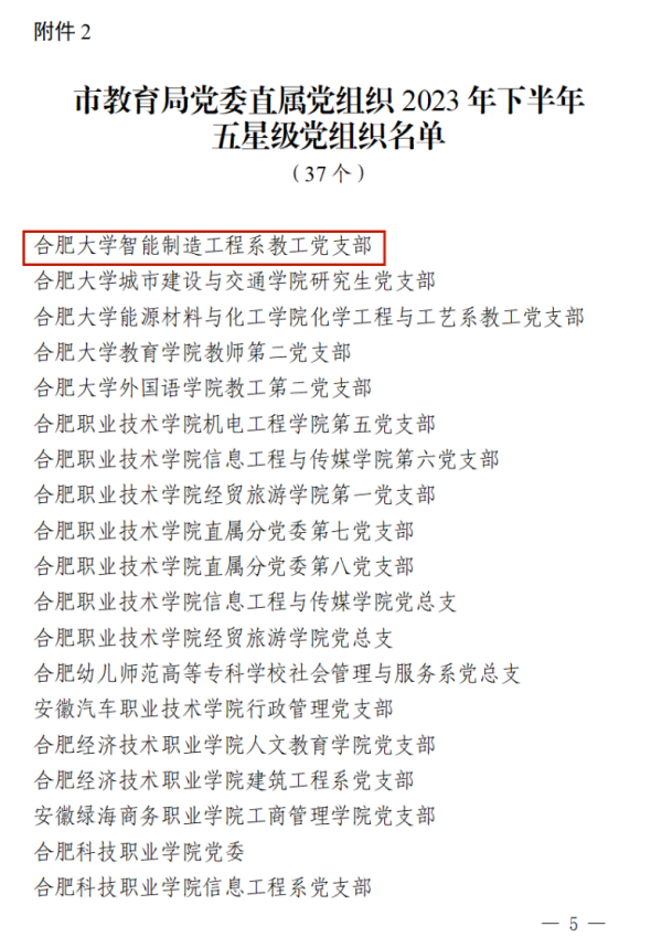 近日,中共合肥市教育局委員會發(fā)布《關(guān)于局黨委直屬黨組織2023年下半年四星級、五星級黨組織評定結(jié)果的通報》(合教黨委〔2024〕23號),合肥大學(xué)先進(jìn)制造工程學(xué)院研究生第一黨支部獲評四星級黨組織,智能制造工程系教工黨支部獲評五星級黨組織。
