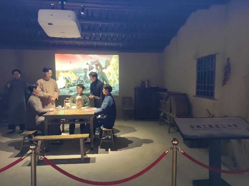 繼續(xù)往前走去,最引人注目的莫過于那組生動再現(xiàn)中共安徽工委成立場景的蠟像。這些蠟像栩栩如生,細(xì)節(jié)之處盡顯匠心,不僅人物的神態(tài)、動作被刻畫得惟妙惟肖,就連當(dāng)時的場景氛圍也被完美地營造出來。蠟像中的每一位人物都仿佛有了生命,他們或激昂陳詞,或沉思默想,或緊握雙拳,共同展現(xiàn)出了中共安徽工委成立時的那份堅定與決心。站在這些蠟像面前,仿佛能夠聽到歷史的回響,感受到那股從過去穿越而來的革命激情。隨后,團隊成員來到了在安徽工委帶領(lǐng)下開展抗戰(zhàn)斗爭事跡的展館部分。這個展館以生動而詳實的方式,再現(xiàn)了那段烽火連天的歲月,展館中設(shè)有3D投影展示,身臨其境地展示了到那個時代的氛圍和斗爭的殘酷。通過現(xiàn)代化的展示手段,歷史不再僅僅是書本上的文字,而是變得鮮活起來,觸動著每一個人的心靈。隨后,團隊成員懷著沉痛的心情,共同閱讀了劉云峰烈士的生平介紹,劉云峰烈士的英勇無畏、堅定信念以及為革命事業(yè)獻(xiàn)身的崇高精神,也將成為激勵我們不斷前行的強大動力。