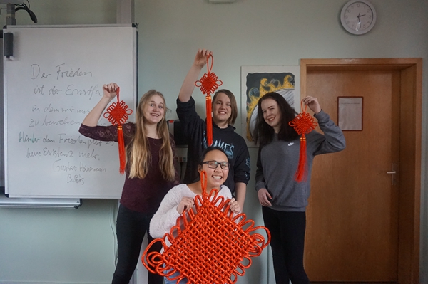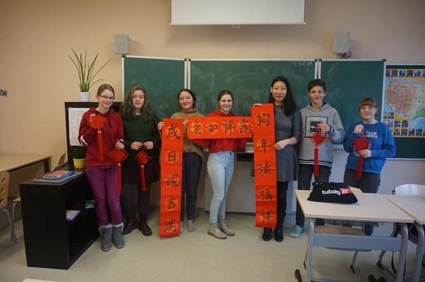 元月二十四日、二十九日和三十一日德國施特拉爾松孔子學(xué)院分別在其開設(shè)中文課程的施特拉爾松德漢薩文理中學(xué),格賴夫斯瓦爾德蒙特蘇里文理中學(xué)以及洪堡文理中學(xué)舉辦了豐富多彩的迎新年、慶春節(jié)文化體驗活動。為了使學(xué)生們對中國的春節(jié)有直觀的感性認(rèn)識,孔院老師帶去了新書寫的對聯(lián)、大紅的“?!弊趾椭袊Y(jié),并詳細(xì)解釋其各自的文化含義。學(xué)生們對這些富含文化元素的物品充滿了興趣,紛紛贊嘆其獨(dú)特與神奇??自豪蠋焸儭俺脽岽蜩F”,教同學(xué)們嘗試寫毛筆字,在古老的漢字藝術(shù)中體味傳統(tǒng)文化的韻味。最后大家一邊品嘗著孔院老師帶來的中國糖果,一邊觀賞傳統(tǒng)動畫片《大鬧天宮》,在歡樂的氛圍中結(jié)束了新鮮有趣的、喜迎春節(jié)的文化之旅。