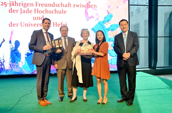 On May 26, an economic delegation from Lower Saxony, Germany, led by Olaf Lies, minister of the Economic, Employment and Energy Department of the State, visited Hefei University to attend the opening ceremony of Sino-German “Logistics 4.0” laboratory and the 25th anniversary of the establishment of partnerships between Jade University of Applied Sciences and Hefei University. Attendees of the events above include Zhang Lifang, Deputy Director of the Foreign Affairs Office of Anhui Province, Wu Chunmei, Deputy Mayor of Hefei Municipality, and Ding Yuhong, Director of the Foreign Affairs Office of the Department of Education of Anhui Province.