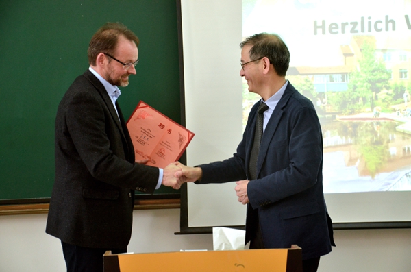 王其東首先回顧了合肥學院中德合作歷程,他從合肥學院中德教育合作示范基地建設的背景介紹了我校的情況,從人才培養(yǎng)、服務社會的角度介紹了“雙元制”項目。他表示,中德教育合作示范基地得到省政府和市政府的重視,并被列入安徽省十三五規(guī)劃中。學校在人才培養(yǎng)方面應該以人為中心,獎學金的設立有利于調動學生學習實踐的主動性和積極性,希望能與大陸公司建立長期的合作關系。