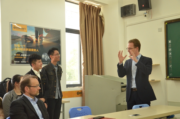 大陸公司一行人蒞臨大陸班學生教室與學生進行了交流。學生們從學習方式、能力的提升和課余活動經(jīng)歷等方面介紹了大陸班帶給他們的全方面能力的提高,并為大陸班未來的發(fā)展提出了建議。Sven Carsten Lange在發(fā)言中說道,期待大陸班能夠取得更好成績。大陸班是以培養(yǎng)應用型人才為目標,有明確的目標在學生學習中是極為重要的。他向同學們介紹了去德國留學的要求,并鼓勵他們保持熱情,努力展示自己的才能。