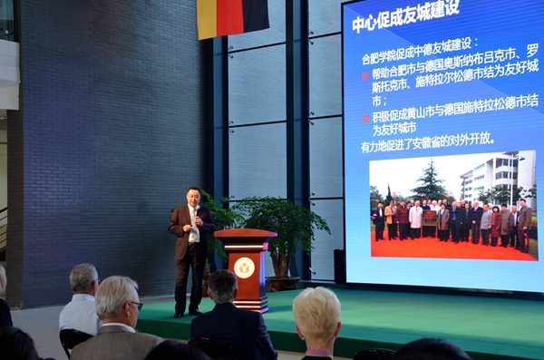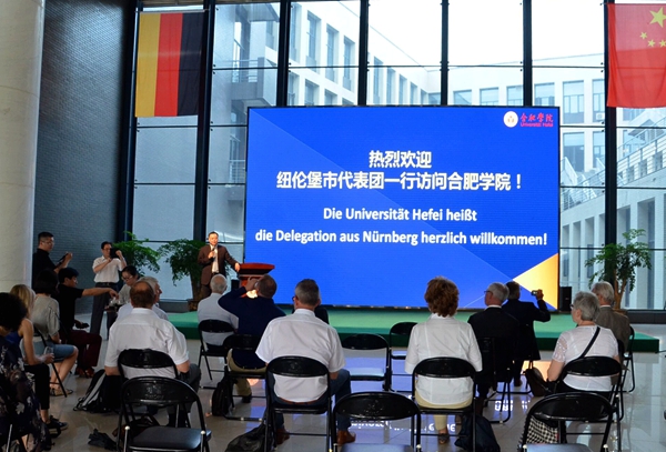 蔡敬民對紐倫堡市代表團(tuán)一行來訪表示歡迎,并從合肥學(xué)院基本情況、中德共建新型大學(xué)建設(shè)的改革成果、中國安徽—德國中心的發(fā)展情況等方面作了介紹。他談到,合肥學(xué)院是一所在改革中誕生,開放中成長,創(chuàng)新中發(fā)展的學(xué)校,被譽(yù)為中國高等教育改革的 “小崗村”。他指出,我校根據(jù)自身辦學(xué)定位,制定應(yīng)用型人才培養(yǎng)方案,致力于打造能力導(dǎo)向的模塊化教學(xué)體系。在對德合作方面,合肥學(xué)院積極借鑒德國本科應(yīng)用型人才培養(yǎng)體系的研究、創(chuàng)新與實(shí)踐,努力突破學(xué)科定勢,打造模塊化課程,重構(gòu)能力導(dǎo)向的應(yīng)用型人才培養(yǎng)教學(xué)體系,走出了一條符合合肥學(xué)院自身改革創(chuàng)新發(fā)展的特色之路。在談到中國安徽——德國中心,他表示,德國中心自啟動以來,堅(jiān)持改革創(chuàng)新協(xié)同發(fā)展,積極開展對德合作交流,在對外打造安徽形象、促進(jìn)中德友好交流合作等方面有重要意義。