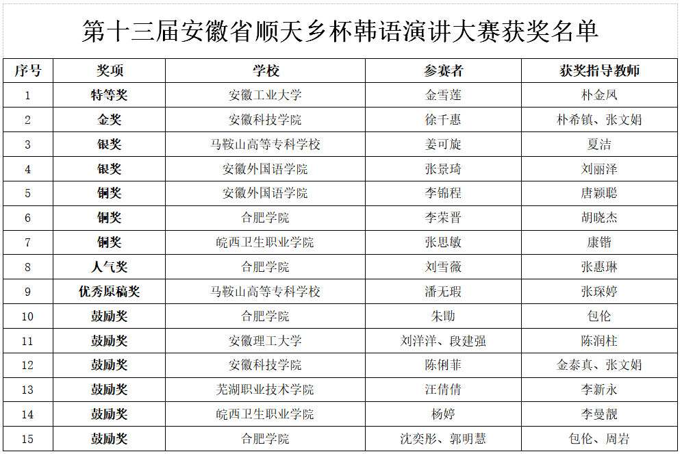 第十三屆安徽省順天鄉(xiāng)杯韓國(guó)語(yǔ)演講大賽獲獎(jiǎng)名單