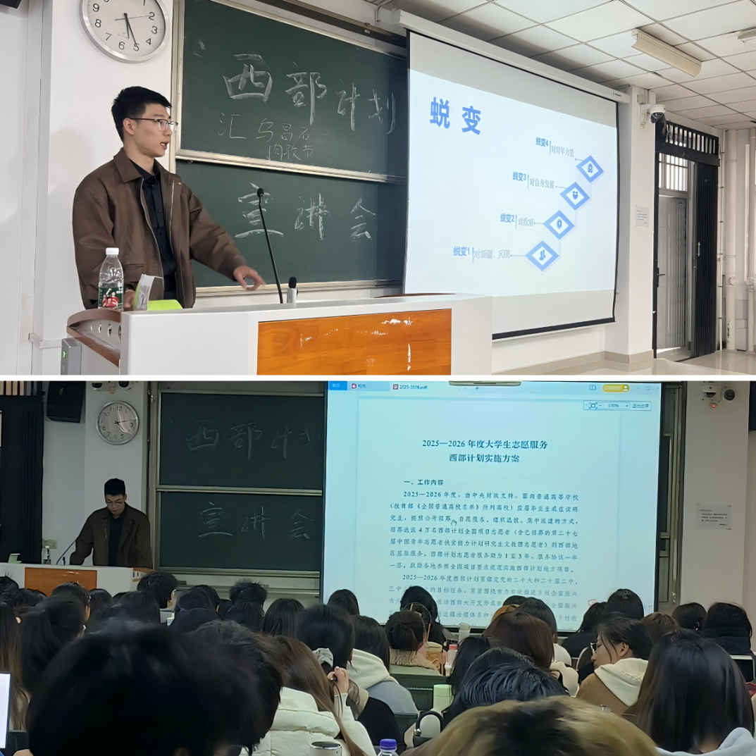 為深化青年學(xué)子對(duì)大學(xué)生西部計(jì)劃的認(rèn)識(shí),激發(fā)服務(wù)西部、奉獻(xiàn)基層的熱情,3月31日下午,經(jīng)濟(jì)與管理學(xué)院在一期4-107教師舉辦“青春赴西部 奮斗正當(dāng)時(shí)”大學(xué)生西部計(jì)劃志愿者感悟分享活動(dòng)。學(xué)院就業(yè)聯(lián)絡(luò)員、輔導(dǎo)員代表及200余名學(xué)生參會(huì),活動(dòng)特邀學(xué)院2020級(jí)優(yōu)秀畢業(yè)生、現(xiàn)擔(dān)任大學(xué)生西部計(jì)劃志愿者的劉晨陽(yáng)擔(dān)任主講。 活動(dòng)伊始,劉晨陽(yáng)以“扎根邊疆 逐綠前行”為題,結(jié)合自身經(jīng)歷展開(kāi)分享。作為學(xué)院2020屆會(huì)計(jì)學(xué)專業(yè)畢業(yè)生,他于2024年通過(guò)大學(xué)生西部計(jì)劃志愿者選拔,遠(yuǎn)赴西部開(kāi)展志愿服務(wù)工作。通過(guò)圖文并茂的PPT和紀(jì)實(shí)視頻,他生動(dòng)講述了在工作單位參與生態(tài)治理、環(huán)境監(jiān)測(cè)、產(chǎn)業(yè)調(diào)研等工作的一線故事。 互動(dòng)環(huán)節(jié)中,學(xué)生們圍繞“專業(yè)如何對(duì)接西部需求”“服務(wù)期間職業(yè)能力提升”“邊疆基層工作挑戰(zhàn)”等踴躍提問(wèn)。劉晨陽(yáng)結(jié)合具體案例一一解答,并特別提到:“經(jīng)管專業(yè)在西部大有用武之地,無(wú)論是鄉(xiāng)村振興中的產(chǎn)業(yè)規(guī)劃、生態(tài)經(jīng)濟(jì)模式創(chuàng)新,還是基層治理中的資源協(xié)調(diào),都需要我們的知識(shí)與熱情?!爆F(xiàn)場(chǎng)掌聲不斷,不少學(xué)生表示深受觸動(dòng)。 下一步,學(xué)院將持續(xù)搭建“政策宣講-榜樣引領(lǐng)-實(shí)踐賦能”的全鏈條育人平臺(tái),引導(dǎo)更多青年學(xué)子投身西部建設(shè),在服務(wù)國(guó)家戰(zhàn)略中彰顯青春力量。 (經(jīng)濟(jì)與管理學(xué)院 撰稿:劉丹青 初審:姚璇 復(fù)審:余宏強(qiáng) 終審:夏丹青) |