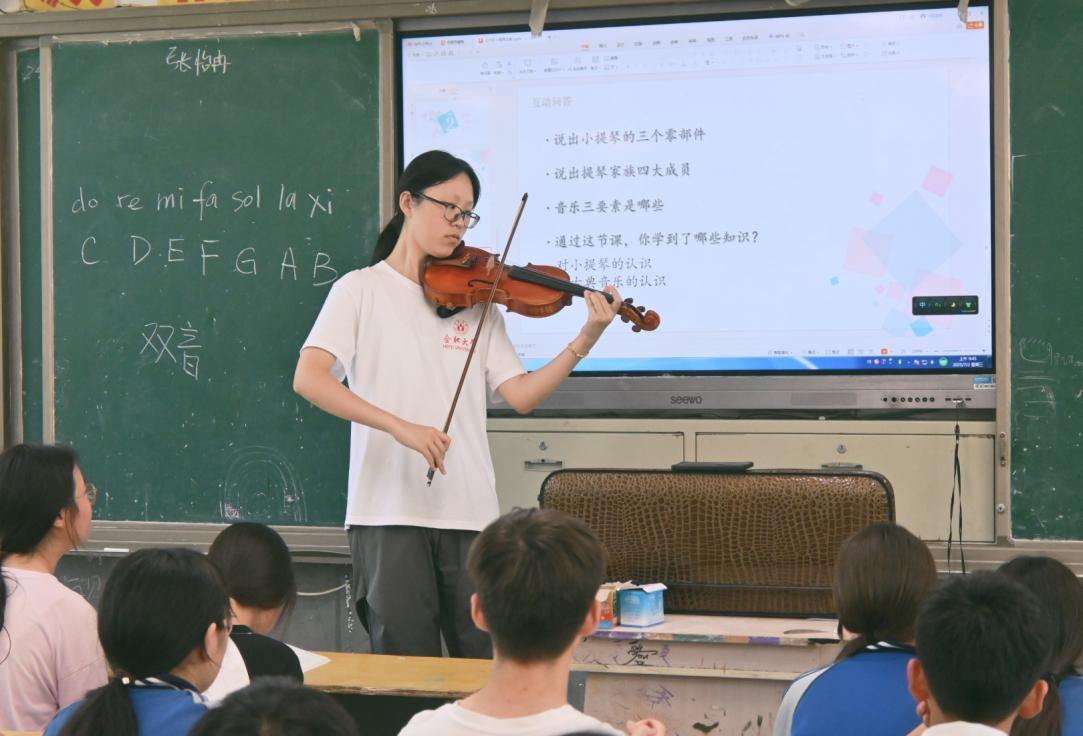與此同時,“小提琴藝術(shù)鑒賞”課堂上,悠揚的琴聲回蕩。團隊成員從基礎(chǔ)樂理知識講起,通過示范演奏和趣味互動,讓學(xué)生們感受小提琴的魅力。學(xué)生們還參與了模仿演奏和音樂知識問答,課堂氛圍活躍。