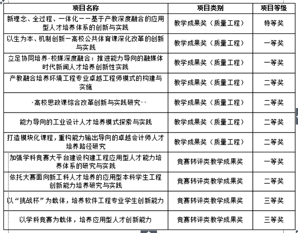 另外,學(xué)校此次評(píng)選中獲得教學(xué)成果獎(jiǎng)11項(xiàng),成績(jī)喜人,其中特等獎(jiǎng)1項(xiàng),一等獎(jiǎng)3項(xiàng),二等獎(jiǎng)5項(xiàng),三等獎(jiǎng)2項(xiàng)。