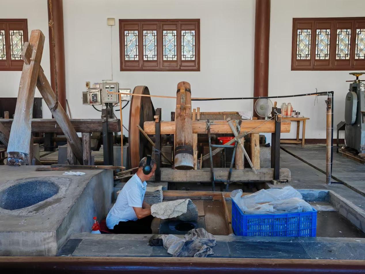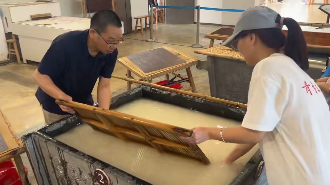 而在古法造紙?bào)w驗(yàn)區(qū),團(tuán)隊(duì)成員們切實(shí)的看到匠人們是如何將一張宣紙制成。在“撈紙”技藝展區(qū)時(shí),成員們看到匠人們手持竹簾浸入紙漿池,輕輕晃動(dòng)、均勻撈起,再經(jīng)壓水、揭紙等環(huán)節(jié),一張薄如蟬翼的濕紙坯逐漸成形,不禁感嘆宣紙這項(xiàng)非遺文化的魅力與技藝的精細(xì)。此外,團(tuán)隊(duì)還參觀(guān)了宣紙曬紙的方式。數(shù)張濕紙整齊排列在木架上,陽(yáng)光透過(guò)紙張投射出斑駁光影,匠人手持長(zhǎng)桿翻紙、調(diào)整角度,確保紙張均勻干燥。