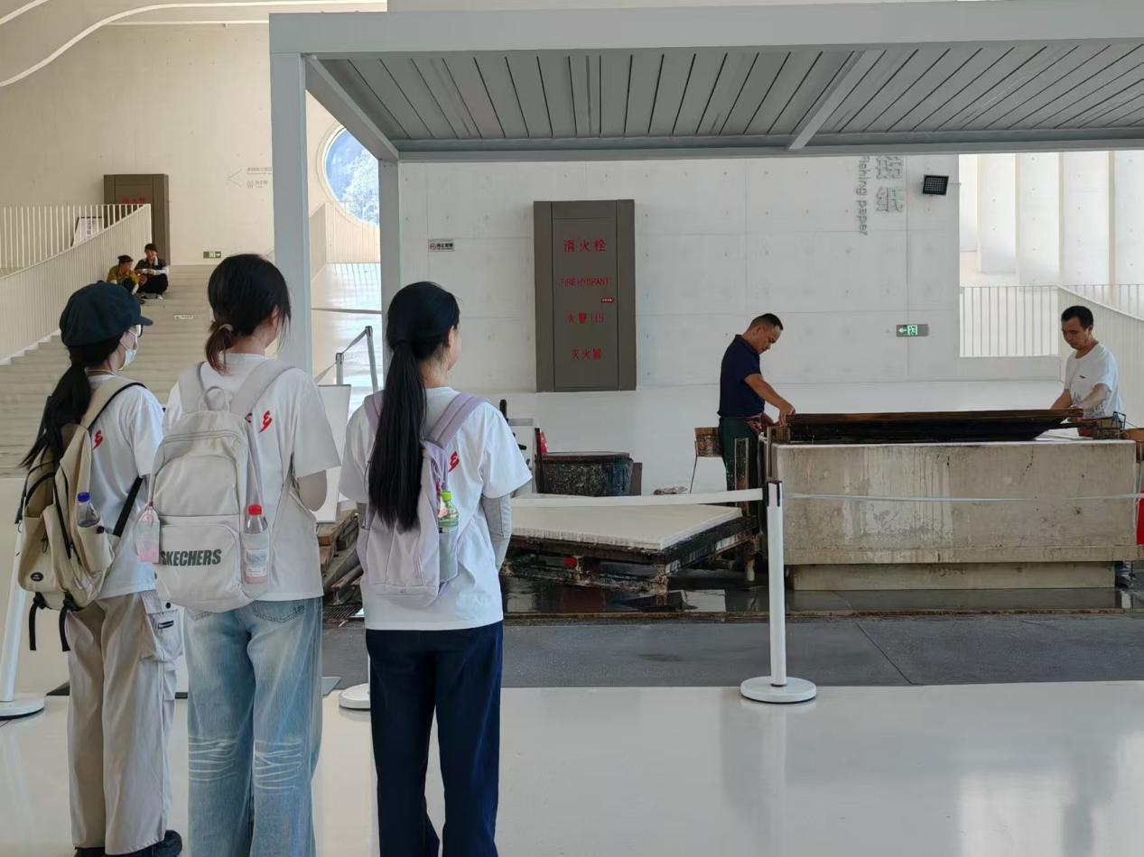 抵達(dá)宣紙文化園后,同學(xué)們首先被園區(qū)現(xiàn)代化的建筑風(fēng)格與濃厚的文化氛圍所吸引。隨后,團(tuán)隊(duì)移步至中國(guó)宣紙博物館。館內(nèi)陳列著從唐代至現(xiàn)代各時(shí)期的宣紙珍品,泛黃的古紙、名家書(shū)畫(huà)真跡、歷代制紙工具等一一陳列,仿佛翻開(kāi)了一部宣紙的“活歷史書(shū)”。在互動(dòng)展區(qū),學(xué)生們通過(guò)高清投影與觸摸屏幕,動(dòng)態(tài)觀(guān)看了宣紙“選料、制漿、撈紙、曬紙、剪紙”等108道工序,讓大家深刻感受到“一張宣紙,百道工序”背后,匠人傾付的耐心、專(zhuān)注與執(zhí)著,那是流淌在歲月里,代代相傳的匠心精神。