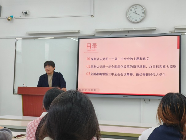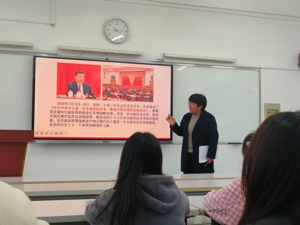 此次黨課圍繞二十屆三中全會(huì)精神,主要從三個(gè)方面開(kāi)展授課:一是深刻認(rèn)識(shí)黨的二十屆三中全會(huì)的主題和意義;二是深刻認(rèn)識(shí)進(jìn)一步全面深化改革的指導(dǎo)思想、總目標(biāo)和重大原則;三是全面準(zhǔn)確領(lǐng)悟三中全會(huì)精神,做優(yōu)秀新時(shí)代大學(xué)生。自十一屆三中全會(huì)以來(lái),我國(guó)改革開(kāi)放事業(yè)全面發(fā)展,二十屆三中全會(huì)更是強(qiáng)調(diào)要“進(jìn)一步全面深化改革”。同時(shí)強(qiáng)調(diào)“中國(guó)式現(xiàn)代化”的五大特點(diǎn),其既有各國(guó)現(xiàn)代化的共同特征更有基于自己國(guó)情的中國(guó)特色。授課過(guò)程中,李秀娟通過(guò)解釋習(xí)近平總書(shū)記提出的“六個(gè)力”,即思政引領(lǐng)力、人才競(jìng)爭(zhēng)力、科技支撐力、民生保障力、社會(huì)協(xié)同力、國(guó)際影響力,引領(lǐng)支部黨員用青春書(shū)寫(xiě)華彩篇章!
