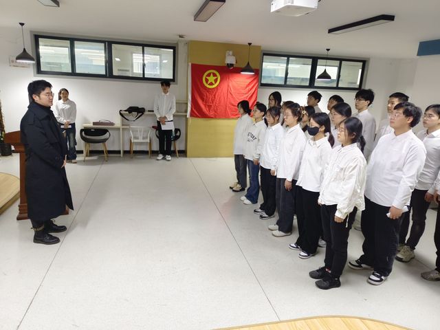 儀式在莊嚴(yán)的國(guó)歌聲中拉開帷幕,全體師生凝神肅立,高唱國(guó)歌。主持人鄭啟桂宣讀新團(tuán)員名單,本次共有17名同學(xué)光榮加入共青團(tuán)。隨后,由團(tuán)委負(fù)責(zé)人楊林為新團(tuán)員們頒發(fā)團(tuán)徽徽章和團(tuán)員證,新團(tuán)員們面向團(tuán)旗,莊嚴(yán)宣誓,展現(xiàn)出青年一代的蓬勃朝氣。