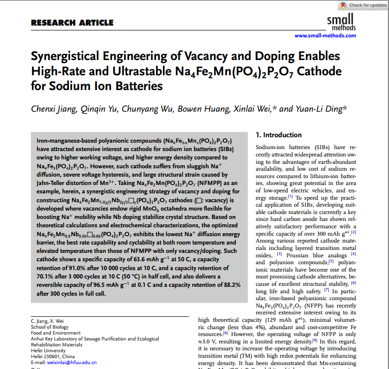 2025年5月,合肥大學(xué)生物食品與環(huán)境學(xué)院22級(jí)資源與環(huán)境專業(yè)研究生蔣晨熙以第一作者身份在國際學(xué)術(shù)期刊《SmallMethods》(IF=10.7,中科院二區(qū))發(fā)表了題為“SynergisticalEngineering of Vacancy and Doping Enables High-Rate and UltrastableNa4Fe2Mn(PO4)2P2O7Cathode for Sodium IonBatteries”的研究論文。我校高級(jí)實(shí)驗(yàn)師衛(wèi)新來、湖南大學(xué)教授丁元力為通訊作者,合肥大學(xué)為第一完成單位。