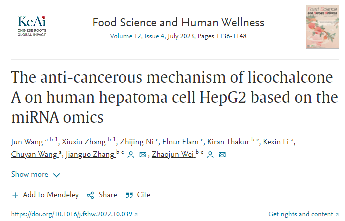 近日,我校生物食品與環(huán)境學(xué)院食品科學(xué)專業(yè)青年教師王郡博士在國際食品科技研究領(lǐng)域頂級期刊《FoodScience and HumanWellness》(食品科學(xué)與人類健康)(IF2022=8.022,中科院農(nóng)林科學(xué)Q1,食品科技Q1)在線發(fā)表了研究論文,該論文的題目為《Theanti-cancerous mechanism of licochalcone A on human hepatoma cellHepG2 based on the miRNAomics》(基于miRNA組學(xué)研究甘草查爾酮A對人肝癌細胞HepG2的抗癌機制)。該研究在miRNA組學(xué)水平上解析甘草活性成分——甘草查爾酮A對人肝癌細胞HepG2的抗癌作用,為清晰認識到甘草的營養(yǎng)價值和藥理學(xué)作用提供了新的視角。