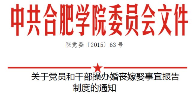 五、黨員和干部操辦婚事應(yīng)提前10天向相關(guān)部門報(bào)告,說明操辦事宜、時(shí)間、地點(diǎn),邀請人數(shù)及范圍等情況,承諾遵守相關(guān)紀(jì)律,填寫《合肥學(xué)院操辦婚喪嫁娶事宜報(bào)告單》(見附件)。喪葬事宜應(yīng)在操辦時(shí)以口頭形式報(bào)告,事后15天內(nèi)補(bǔ)報(bào)《合肥學(xué)院操辦婚喪嫁娶事宜報(bào)告單》。