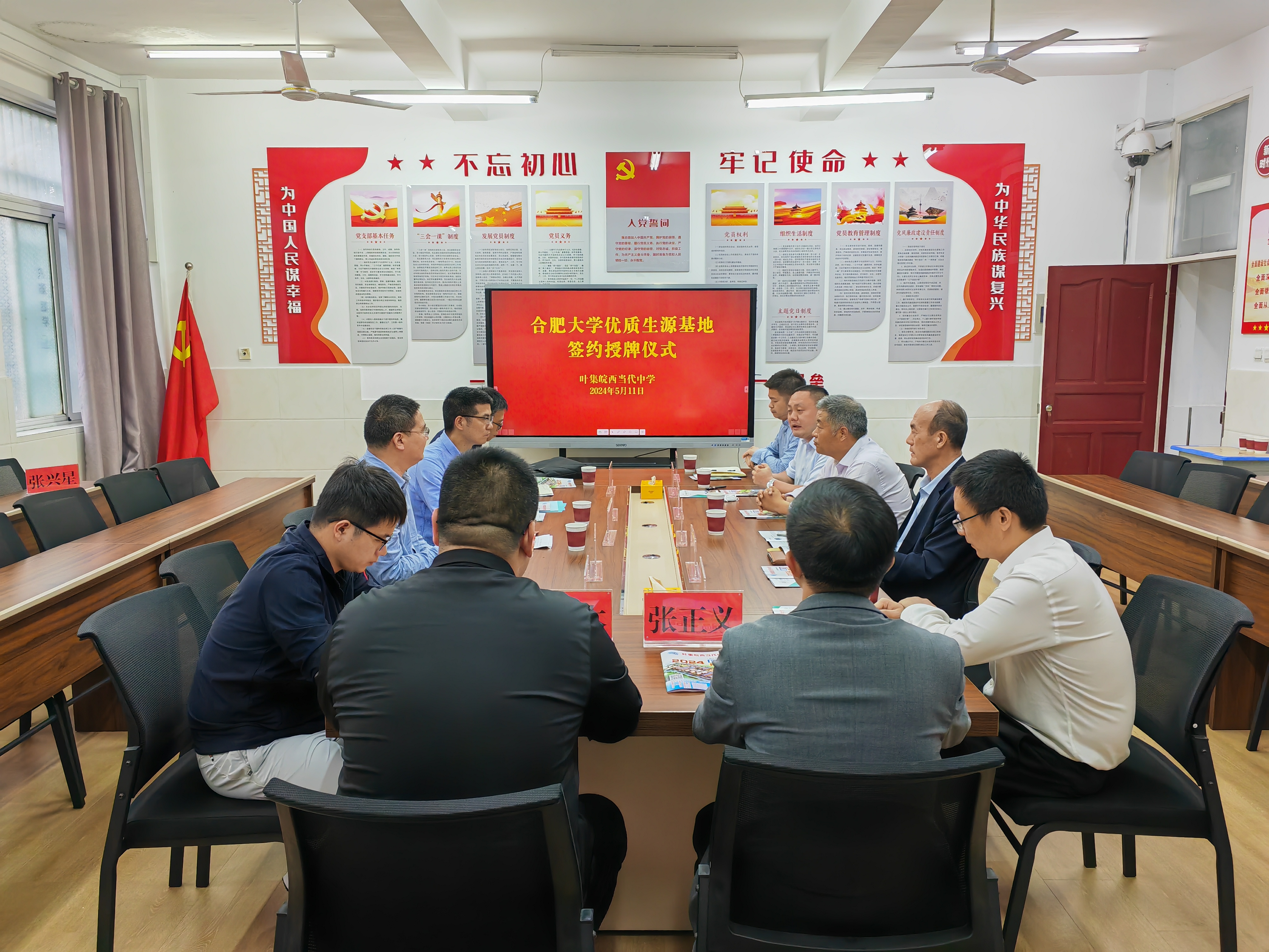 在安師大附屬葉集中學(xué),阮班鋒就我院在人才培養(yǎng)、教學(xué)科研、科技創(chuàng)新、專業(yè)設(shè)置等方面的特點(diǎn)與優(yōu)勢進(jìn)行了詳細(xì)介紹,希望通過共建優(yōu)質(zhì)生源基地的方式,進(jìn)一步加強(qiáng)兩校之間的交流與合作。安師大附屬葉集中學(xué)校長章志學(xué)表示,合肥大學(xué)授予安師大附屬葉集中學(xué)優(yōu)質(zhì)生源基地稱號(hào),不僅是對(duì)學(xué)校辦學(xué)成果和人才培養(yǎng)的充分認(rèn)可,更為兩校今后深入開展交流與合作奠定了堅(jiān)實(shí)的基礎(chǔ)。座談會(huì)后,雙方簽署《合肥大學(xué)優(yōu)質(zhì)生源基地共建協(xié)議書》,并舉行了合肥大學(xué)和安師大附屬葉集中學(xué)“優(yōu)質(zhì)生源基地”授牌儀式。