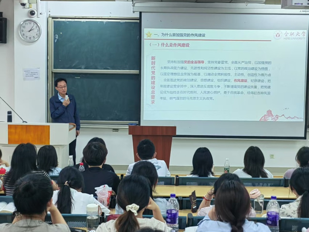 5月15日下午,校黨委委員、紀(jì)委書記、省監(jiān)委駐合肥大學(xué)監(jiān)察專員吳功福走進(jìn)課堂,以“深入學(xué)習(xí)貫徹習(xí)近平總書記關(guān)于加強(qiáng)黨的作風(fēng)建設(shè)的重要論述”為題,為2023級(jí)小學(xué)教育專業(yè)的大學(xué)生講授了一堂精彩的思政課。 吳功福重點(diǎn)從為什么要加強(qiáng)黨的作風(fēng)建設(shè)、深入領(lǐng)會(huì)習(xí)近平總書記關(guān)于加強(qiáng)黨的作風(fēng)建設(shè)的重要內(nèi)涵和精神實(shí)質(zhì)、加強(qiáng)黨的作風(fēng)建設(shè)的切入口和動(dòng)員令:八項(xiàng)規(guī)定何以改變中國(guó)、作風(fēng)建設(shè)永遠(yuǎn)在路上等四個(gè)方面展開授課。通過理論闡釋與案例教學(xué),視頻、圖片等元素的融入,吳功福對(duì)于習(xí)近平總書記關(guān)于加強(qiáng)黨的作風(fēng)建設(shè)的重要論述作了系統(tǒng)、深入的闡述與講解,引發(fā)同學(xué)們強(qiáng)烈的思想共鳴。 思政課是落實(shí)立德樹人根本任務(wù)的關(guān)鍵課程。校領(lǐng)導(dǎo)走上思政課講臺(tái),是深入貫徹落實(shí)習(xí)近平總書記關(guān)于學(xué)校思政課建設(shè)的重要指示精神,充分發(fā)揮思政課鑄魂育人主渠道、主陣地作用的重要舉措,為推動(dòng)學(xué)校思政教育高質(zhì)量發(fā)展提供了有力的保障。(圖/文:陶德強(qiáng)) |