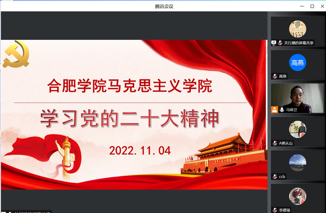 學(xué)深悟透黨的二十大精神 ——馬克思主義學(xué)院學(xué)習(xí)黨的二十大精神(二) 11月4日下午,馬克思主義學(xué)院再次開展學(xué)習(xí)貫徹黨的二十大精神線上學(xué)習(xí)會(huì)。馬院全體專兼職思政課教師參加學(xué)習(xí)。 會(huì)上,馬院副院長馬保衛(wèi)帶領(lǐng)全體專兼職教師認(rèn)真學(xué)習(xí)了黨的二十大報(bào)告。馬院長指出,二十大報(bào)告深刻闡釋了新時(shí)代堅(jiān)持和發(fā)展中國特色社會(huì)主義的一系列重大理論和實(shí)踐問題,描繪了全面建設(shè)社會(huì)主義現(xiàn)代化國家、全面推進(jìn)中華民族偉大復(fù)興的宏偉藍(lán)圖,為新時(shí)代新征程黨和國家事業(yè)發(fā)展、實(shí)現(xiàn)第二個(gè)百年奮斗目標(biāo)指明了前進(jìn)方向、確立了行動(dòng)指南,是黨和人民智慧的結(jié)晶,是黨團(tuán)結(jié)帶領(lǐng)全國各族人民奪取中國特色社會(huì)主義新勝利的政治宣言和行動(dòng)綱領(lǐng),是馬克思主義的綱領(lǐng)性文獻(xiàn)。學(xué)習(xí)宣傳貫徹黨的二十大精神是當(dāng)前和今后一個(gè)時(shí)期的首要政治任務(wù),馬院全體教師要圍繞“九個(gè)深刻領(lǐng)會(huì)”,全面準(zhǔn)確學(xué)習(xí)二十大精神,深入理解內(nèi)涵,精準(zhǔn)把握外延。要原原本本、逐字逐句學(xué)習(xí)黨的二十大報(bào)告和黨章,學(xué)習(xí)習(xí)近平總書記在黨的二十屆一中全會(huì)上的重要講話精神,切實(shí)把思想和行動(dòng)統(tǒng)一到黨的二十大精神上來。 馬院各教研室教師圍繞學(xué)深悟透二十大精神,結(jié)合各自工作實(shí)際,暢談學(xué)習(xí)體會(huì)。“綱要”教研室彭慧艷老師在發(fā)言中指出,二十大報(bào)告立意深遠(yuǎn),思想深邃,作為思政課教師,要學(xué)懂弄通,準(zhǔn)確理解為黨育人,為國育才的初心使命,立足崗位,堅(jiān)定歷史自信,發(fā)揮歷史主動(dòng),將二十大報(bào)告新觀點(diǎn),新思想、新舉措融入課堂教學(xué)?!霸怼苯萄惺抑魅勿堫@蠋熤赋?,習(xí)近平總書記在二十大報(bào)告提出,中國共產(chǎn)黨為什么能,中國特色社會(huì)主義為什么好,歸根到底是馬克思主義行,是中國化時(shí)代化馬克思主義行。這里由原來的一個(gè)“行”發(fā)展成兩個(gè)“行”,充分表明了我們黨勇于理論探索和創(chuàng)新的精神氣質(zhì)。作為思政課教師,深受鼓舞的同時(shí)倍感責(zé)任重大,今后要在大思政課格局下深耕教學(xué),注重創(chuàng)新,切實(shí)把二十大精神融入教學(xué),講深講透講活?!暗路ā苯萄惺抑魅瓮跄芤蠋熤赋觯h的二十大報(bào)告提出了一系列新觀念點(diǎn),新論斷、新思想,作為思政課教師,要吃透弄懂,深刻領(lǐng)悟,這樣才能準(zhǔn)確將二十大精神融入教學(xué),提高思政教學(xué)的時(shí)效性?!案耪摗苯萄惺抑魅谓鹦》嚼蠋熤赋?,二十大報(bào)告中提到“增強(qiáng)中華文明傳播力影響力,堅(jiān)守中華文化立場,講好中國故事,傳播中國好聲音,展現(xiàn)可信、可愛、可敬的中國形象,推動(dòng)中華文化更好走向世界”,這段話有四層內(nèi)涵,涉及傳播立場、傳播內(nèi)容、傳播方法和傳播目標(biāo)。習(xí)近平總書記關(guān)于中華文化國際傳播的指導(dǎo)思想,發(fā)展了中國化馬克思主義理論,開辟了中國化馬克思主義國際傳播的新境界。“習(xí)近平新時(shí)代中國特色社會(huì)主義思想概論”教研室主任謝敏芳老師指出,二十大報(bào)告提出要完善思想政治工作體系,推進(jìn)大中小學(xué)思想政治教育一體化建設(shè),作為思政課教師,備感振奮,深受鼓舞,要堅(jiān)定政治信仰,做好經(jīng)師,做積極進(jìn)取的思政課教師,上學(xué)生喜愛的思政課?!靶蝿菖c政策”教研室主任閃茜菁老師在發(fā)言中指出,二十大報(bào)告是一篇馬克思主義的綱領(lǐng)性文獻(xiàn),是我們黨以全新的視野進(jìn)行理論探索和創(chuàng)新的結(jié)果。作為思政課教師,要推動(dòng)二十大精神,特別是習(xí)近平新時(shí)代中國特色社會(huì)主義思想進(jìn)課堂、進(jìn)教材、進(jìn)頭腦,重點(diǎn)回答好、解釋好世界關(guān)心的我國發(fā)展的重大理論和實(shí)際問題,進(jìn)一步提升思政課教學(xué)水平。 最后,蘇冰副院長作總結(jié)發(fā)言。蘇院長指出,黨的十八大以來的十年,黨和國家事業(yè)取得歷史性成就、發(fā)生歷史性變革,續(xù)寫了世所罕見的經(jīng)濟(jì)快速發(fā)展奇跡和社會(huì)長期穩(wěn)定奇跡。新時(shí)代十年的偉大變革,在黨史、新中國史、改革開放史、社會(huì)主義發(fā)展史、中華民族發(fā)展史上具有里程碑意義。在新征程上,世界之變、時(shí)代之變、歷史之變正以前所未有的方式展開,要實(shí)現(xiàn)中華民族偉大復(fù)興目標(biāo),必須勇于進(jìn)行具有許多新的歷史特點(diǎn)的偉大斗爭,準(zhǔn)備付出更為艱巨、更為艱苦的努力。學(xué)習(xí)和貫徹黨的二十大精神,要做到五個(gè)“牢牢把握”,牢記三個(gè)“務(wù)必”,堅(jiān)定理想同心同德,腳踏實(shí)地善作善成,矢志不渝篤行不怠,方能不負(fù)時(shí)代不負(fù)人民。作為高校思政課教師,我們要認(rèn)真學(xué)習(xí)和深刻領(lǐng)悟黨的二十大精神,牢牢把握習(xí)近平新時(shí)代中國特色社會(huì)主義思想的世界觀和方法論,