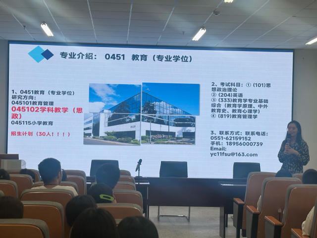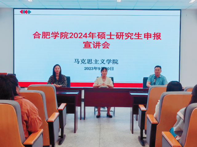2024年馬克思主義學(xué)院學(xué)科教學(xué)(思政)研究生 招生宣講 為進(jìn)一步擴(kuò)大學(xué)科教學(xué)(思政)研究生生源,提升招生質(zhì)量,拓展我校學(xué)科教學(xué)(思政)專業(yè)第一年招生渠道,馬克思主義學(xué)院積極推進(jìn)2024年學(xué)科教學(xué)(思政)專業(yè)研究生招生宣傳工作。 9月20日下午,王芳主任和葛玉榮博士赴淮南師范學(xué)院開展馬克思主義學(xué)院學(xué)科教學(xué)(思政)專業(yè)研究生招生宣講工作。淮南師范學(xué)院副院長孫自勝主持會議,馬克思主義學(xué)院大四年級畢業(yè)生80余人參加了宣講會。 首先,王芳主任介紹了本次宣講的主題及相關(guān)內(nèi)容,隨后葛玉榮博士從學(xué)校簡介、馬克思主義學(xué)院介紹、學(xué)科優(yōu)勢分析、本年度學(xué)科教學(xué)(思政)專業(yè)考研大綱以及考研經(jīng)驗分享等幾個方面向同學(xué)們做了較為詳細(xì)的講解,介紹了合肥學(xué)院學(xué)科教學(xué)(思政)首年招生的報考優(yōu)勢,表達(dá)了對同學(xué)們報考合肥學(xué)院學(xué)科教學(xué)(思政)的真誠期待。 本次宣講會得到了淮南師范學(xué)院馬克思主義學(xué)院的大力支持,讓更多學(xué)生了解我院學(xué)科建設(shè)和研究生招生工作,為更多優(yōu)秀學(xué)生報考我院打下堅實的基礎(chǔ)。(馬克思主義學(xué)院) |