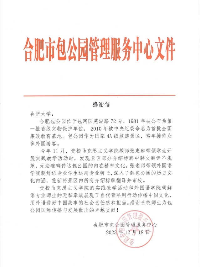 馬克思主義學(xué)院用好“社會(huì)大課堂”推進(jìn)“大思政課”建設(shè) 為進(jìn)一步引導(dǎo)學(xué)生在實(shí)地體驗(yàn)和親身經(jīng)歷中感受國(guó)家發(fā)展的磅礴力量,自覺(jué)投身到實(shí)現(xiàn)中華民族偉大復(fù)興的實(shí)踐中,馬克思主義學(xué)院積極開展思政課實(shí)踐教學(xué),著力推動(dòng)思政“小課堂”與社會(huì)“大課堂”有效銜接,讓思政課“活”起來(lái),讓學(xué)生“動(dòng)”起來(lái)。 今年11月,馬克思主義學(xué)院教師張惠琳帶領(lǐng)學(xué)生前往合肥包公園景區(qū)開展實(shí)踐教學(xué)活動(dòng)。該園于2010年被中央紀(jì)委命名為首批全國(guó)廉政教育基地,展現(xiàn)了包公忠、孝、清、廉的一生,是學(xué)習(xí)和發(fā)揚(yáng)中華優(yōu)秀傳統(tǒng)文化,特別是夯實(shí)清正廉潔思想,培養(yǎng)廉潔自律道德操守的重要教育基地。與此同時(shí),景區(qū)充分發(fā)揮其帶動(dòng)和輻射作用,常年接待世界各國(guó)游客,是學(xué)生樹立文化自信,學(xué)習(xí)用外語(yǔ)講好中國(guó)故事的生動(dòng)課堂。 學(xué)生們通過(guò)此次活動(dòng),深刻感悟了包拯“孝忠、民本、剛正、清廉”的思想及中國(guó)傳統(tǒng)文化內(nèi)涵,但同時(shí)發(fā)現(xiàn)景區(qū)部分介紹標(biāo)牌外文翻譯不規(guī)范,無(wú)法準(zhǔn)確傳達(dá)其內(nèi)在的精神文化。教師在與景區(qū)管理服務(wù)中心溝通后,引導(dǎo)學(xué)生運(yùn)用專業(yè)特長(zhǎng),以包公園的深厚歷史文化內(nèi)涵為依托,重新將景區(qū)內(nèi)所有介紹標(biāo)牌翻譯并請(qǐng)專家審校。12月18日,合肥包公園管理服務(wù)中心向合肥大學(xué)發(fā)來(lái)感謝信,信中感謝馬克思主義學(xué)院的實(shí)踐教學(xué)活動(dòng)和外國(guó)語(yǔ)學(xué)院朝鮮語(yǔ)專業(yè)師生的無(wú)私奉獻(xiàn),贊揚(yáng)我校師生用行動(dòng)傳播中國(guó)文化,展現(xiàn)了當(dāng)代青年用外語(yǔ)講好中國(guó)故事的社會(huì)責(zé)任感和擔(dān)當(dāng)。 馬克思主義學(xué)院領(lǐng)導(dǎo)表示將繼續(xù)深入貫徹落實(shí)習(xí)近平總書記關(guān)于“大思政課”的重要指示,聚焦立德樹人的根本任務(wù),推動(dòng)用黨的創(chuàng)新理論鑄魂育人,突出實(shí)踐導(dǎo)向,充分調(diào)動(dòng)全社會(huì)力量和資源,著力發(fā)揮校社聯(lián)合的大平臺(tái)作用,協(xié)力同行,譜寫大學(xué)生實(shí)踐教育高質(zhì)量發(fā)展新篇章。(張惠琳/文圖 蘇冰/審核 武奎/編發(fā)) |