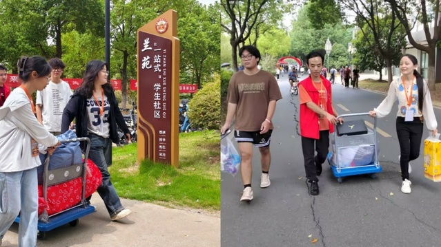 在迎新現(xiàn)場,黨員志愿者們堅守大門第一站,化身“紅馬甲”,以飽滿的熱情為和貼心的服務迎接來自各地的新生們,他們幫助新生搬運行李,主動與新生和家長面對面交流,介紹學校的各處設施,解答新生的入學困惑。