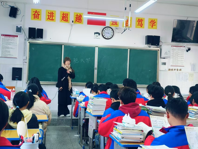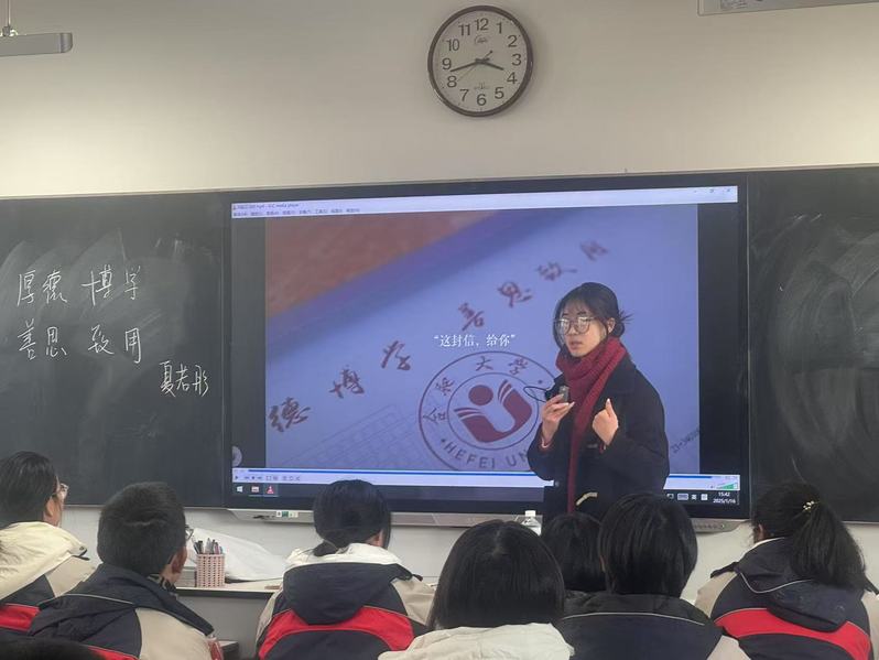 本次活動涉及合肥一中、合肥六中、合肥168中學(xué)等省內(nèi)外28所中學(xué),影響了近千位高中學(xué)生。來自24級新聞1班的夏若彤返回母校阜陽紅星中學(xué),她以介紹合肥大學(xué)的特色與優(yōu)勢為核心,向同學(xué)們展示了大學(xué)生活的魅力,詳細(xì)講解了學(xué)校的專業(yè)設(shè)置和課程安排,特別是一些特色專業(yè)和同學(xué)們感興趣的熱門專業(yè)。同時還分享了豐富多彩的校園活動,包括社團、體育賽事、學(xué)科競賽和志愿服務(wù)等內(nèi)容,展現(xiàn)了大學(xué)生活的多元化。在宣講過程中,夏若彤積極與高中生們積極互動,耐心回答他們提出的關(guān)于大學(xué)生活、學(xué)習(xí)規(guī)劃等方面的問題,并結(jié)合自身經(jīng)歷分享了經(jīng)驗。