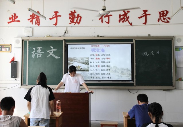 7月1日上午,合肥大學(xué)語言文化與傳媒學(xué)院暑期三下鄉(xiāng)團隊教學(xué)組在石板沖鄉(xiāng)初級中學(xué)成功開啟了教學(xué)第一課。成員以經(jīng)典古詩《觀滄?!窞檩d體,精心設(shè)計教學(xué)環(huán)節(jié),為學(xué)生們帶來了一場沉浸式的詩詞盛宴,用青春的熱情與學(xué)識為鄉(xiāng)村語文課堂注入了盎然生機。