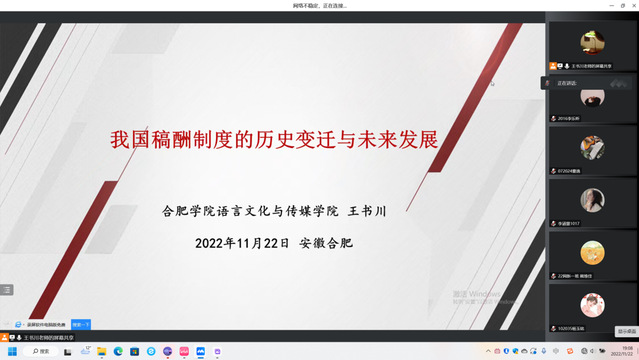 2022年11月22日晚7點,語言文化與傳媒學(xué)院舉辦了一場主題為“我國稿酬制度的歷史變遷與未來發(fā)展”的學(xué)術(shù)講座。講座在騰訊會議線上進行,由語言文化與傳媒學(xué)院青年教師王書川主講,22級新聞學(xué)、22級網(wǎng)絡(luò)與新媒體兩個專業(yè)共146名學(xué)生參加。