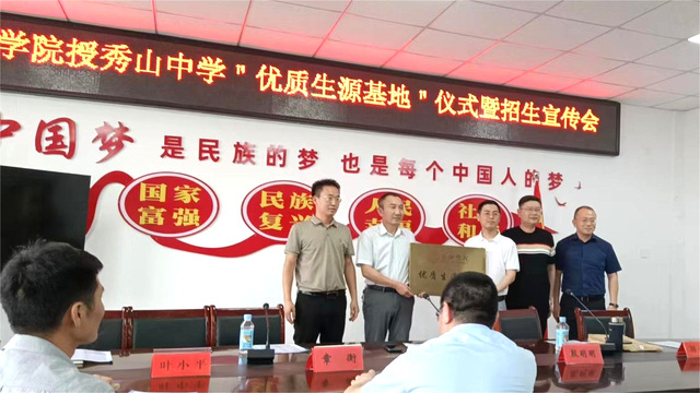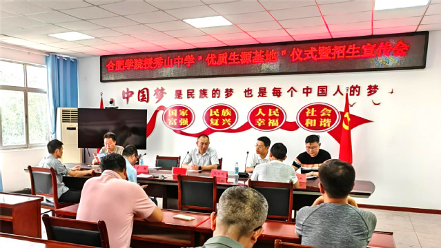 秀山中學坐落于安慶市獨秀山南麓,學校歷史悠久,薪火相傳迄今已近六十年。在優(yōu)質(zhì)生源基地簽約暨授牌儀式上,殷明明副院長與秀山中學校長程一文、副校長劉心喜、副校長葉小平等學校領導進行了深入交流。殷明明副院長介紹了合肥學院的辦學定位和語言文化與傳媒學院的專業(yè)特色,強調(diào)學院堅持立德樹人根本任務、堅持全員全過程全方位育人、堅持育人中心,他說學院本著協(xié)同育人、相互促進、共同發(fā)展的合作理念,積極構建優(yōu)質(zhì)生源基地長效合作機制,努力打造一流育人體系,培養(yǎng)一流人才方陣。程一文校長表示將通過優(yōu)質(zhì)生源基地建設實現(xiàn)兩校在合作育人各環(huán)節(jié)上協(xié)同發(fā)力、同頻共振,不斷深化校際合作,以全方位育人為出發(fā)點和落腳點,為合肥學院輸送更多高質(zhì)量生源。