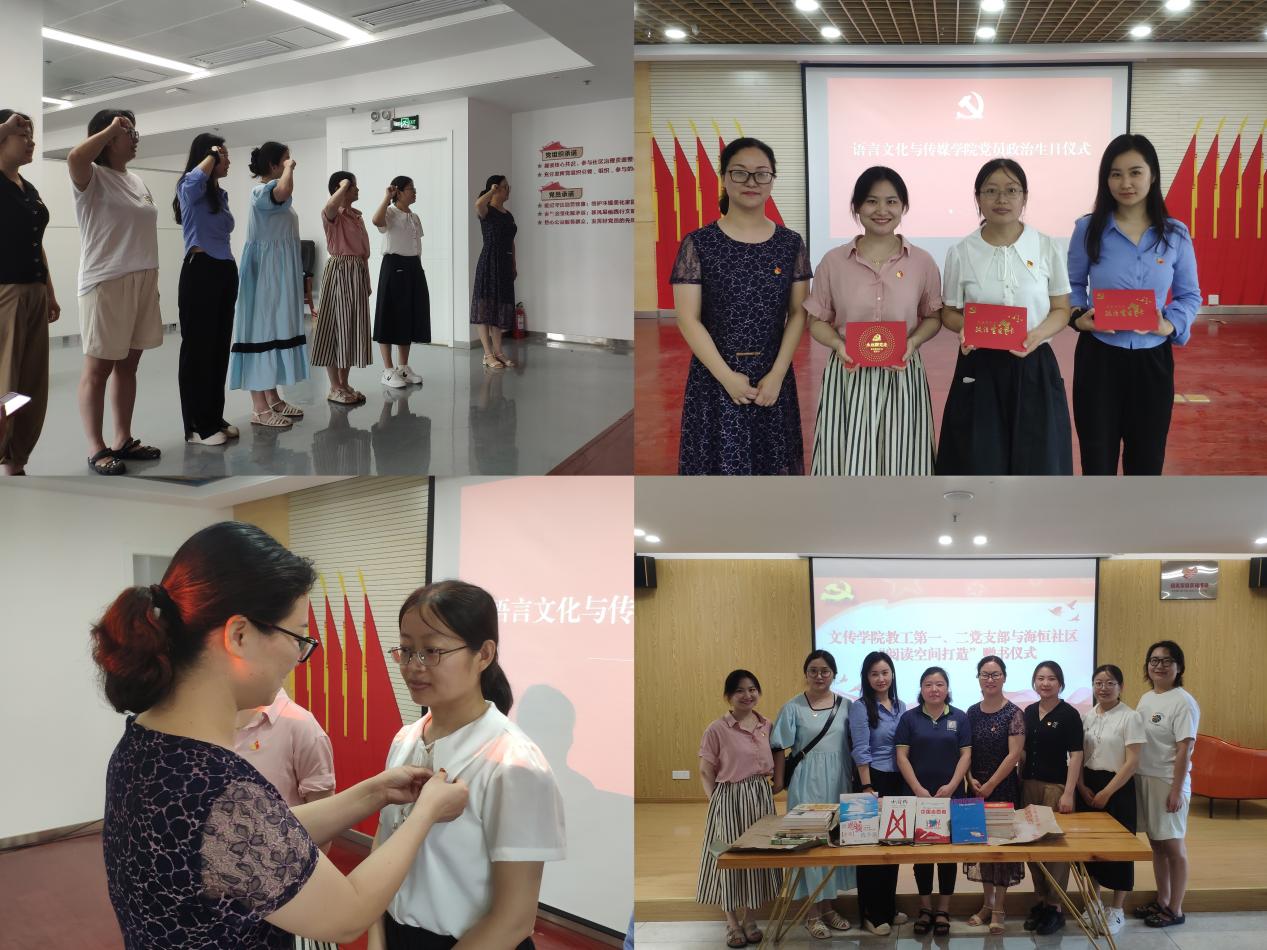 為慶祝中國(guó)共產(chǎn)黨成立102周年,增強(qiáng)黨性教育,7月4日下午,語(yǔ)言文化與傳媒學(xué)院教工第一、二黨支部前往海恒社區(qū)進(jìn)行主題黨日活動(dòng)。此次活動(dòng)有兩項(xiàng)議程:一是在海恒社區(qū)進(jìn)行閱讀推廣活動(dòng),二是為支部黨員過政治生日、重溫入黨誓詞。