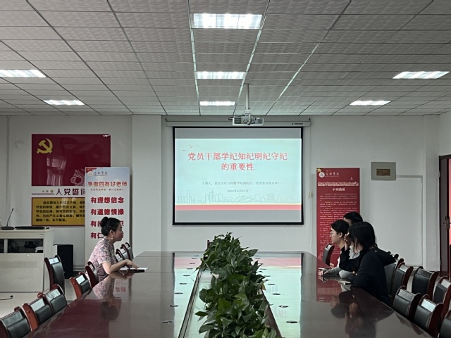 2024年6月13日下午,合肥大學(xué)語(yǔ)言文化與傳媒學(xué)院研究生黨支部在學(xué)院大會(huì)議室開展以“黨員干部學(xué)紀(jì)知紀(jì)明紀(jì)守紀(jì)的重要性”為主題的黨紀(jì)學(xué)習(xí)教育專題黨課。黨課由語(yǔ)言文化與傳媒學(xué)院副院長(zhǎng)查金萍教授主講,研究生黨支部全體黨員參加。