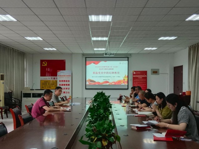 6月18日下午,語言文化與傳媒學院教工第一黨支部在學院大會議室舉行了黨紀學習教育專題黨課。此次黨課題為“重溫黨史中的紀律教育”,由院長丁增武主講,教工第一黨支部全體黨員參加。