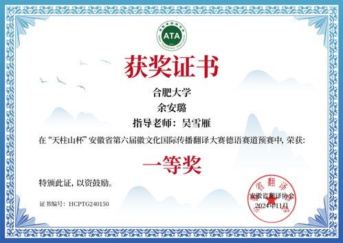 近日,“天柱山杯”第六屆徽文化國際傳播翻譯大賽預賽成功舉行。外國語學院德語專業(yè)53位同學參加,獲一等獎1名、二等獎6名、三等獎15名、優(yōu)秀獎17名。其中余安璐同學將代表合肥大學參加“天柱山杯”第六屆徽文化國際傳播翻譯大賽德語賽道決賽,與其他優(yōu)秀選手同臺競技。