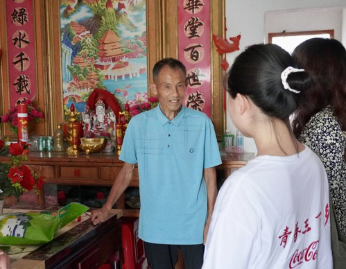 大雨之下,團(tuán)隊(duì)成員最后一同驅(qū)車(chē)前往鄰村拜訪(fǎng)最后一名老黨員徐應(yīng)宏。他同時(shí)是一名光榮的退伍軍人、為村子建設(shè)發(fā)展貢獻(xiàn)了三十年黃金歲月的村書(shū)記。團(tuán)隊(duì)成員同徐老先生進(jìn)行了熱切交流,即使老先生身體抱恙,在談及黨和人民時(shí)雙眼仍炯炯有神。他向隨行學(xué)生們表達(dá)了對(duì)黨的崇高敬意,并囑咐成員們要心懷理想,一心向黨,不負(fù)使命。預(yù)備黨員姚海峰在此行中表示,聆聽(tīng)了多位老黨員的光榮事跡和心路歷程,這更加堅(jiān)定了他不忘初心、牢記使命,為實(shí)現(xiàn)中華民族偉大復(fù)興的中國(guó)夢(mèng)而不懈奮斗的至高理想。