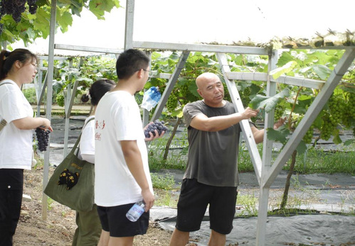 78日上午,三下鄉(xiāng)團隊成員在指導(dǎo)老師張正華的帶領(lǐng)下先后走進(jìn)美菊香家庭農(nóng)場和合肥春盈農(nóng)業(yè)科技有限公司,實地參觀葡萄現(xiàn)代農(nóng)業(yè)產(chǎn)業(yè)園。這里,南太湖特早、陽光玫瑰等優(yōu)質(zhì)葡萄品種在陽光下熠熠生輝,每一顆都承載著果農(nóng)的辛勤與汗水。你看這些葡萄都套著紙袋子,目的就是為了果子光亮,并且在打除草藥的時候保證果子不接觸到藥物。王代美指著園子里的排列整齊的葡萄合不攏嘴。我們家的葡萄采用大棚種植與噴灌技術(shù),實現(xiàn)了葡萄的早熟與高產(chǎn)”馬長安驕傲地說。