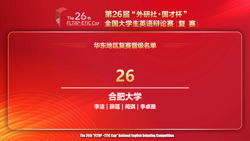 “外研社·國才杯”全國大學(xué)生英語辯論賽是2023年全國普通高校學(xué)科競賽排行榜內(nèi)競賽項目,由北京外國語大學(xué)主辦,外語教學(xué)與研究出版社、北京外國語大學(xué)中國外語測評中心、北京外研在線數(shù)字科技有限公司承辦。本屆大賽于2023年11月啟動,復(fù)賽分為華北、華東、華南和華西四個賽區(qū),采取線上比賽的形式。復(fù)賽包含五輪循環(huán)賽和總決賽。在循環(huán)賽環(huán)節(jié),各參賽隊伍須完成5輪比賽獲得相應(yīng)積分。最后,積分排名靠前的隊伍獲得全國決賽的參賽資格。