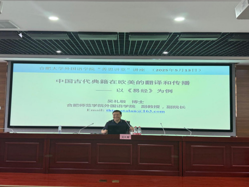 2025 年 5 月 13 日下午,我院邀請(qǐng)合肥師范學(xué)院外國(guó)語(yǔ)學(xué)院吳禮敬副院長(zhǎng),為學(xué)院師生帶來(lái)了一場(chǎng)主題為“中國(guó)古代典籍在歐美的翻譯和傳播 —— 以《易經(jīng)》為例” 的學(xué)術(shù)講座。講座在6號(hào)樓報(bào)告廳舉行,外國(guó)語(yǔ)學(xué)院百余人聆聽(tīng)了講座。