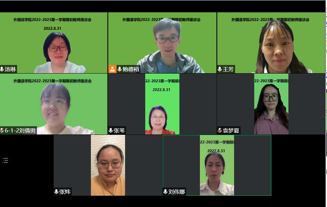 為保障新學(xué)期教學(xué)工作順利運(yùn)行及提高教學(xué)質(zhì)量,根據(jù)學(xué)校期初教學(xué)檢查要求,外國語學(xué)院8月31日舉行期初教師座談會(huì)。會(huì)議由我院督導(dǎo)組組長湯琳老師主持,英語系張葦、王芳,德語系張煒、劉倩男,東語系劉偉娜、袁夢夏六位老師參加。