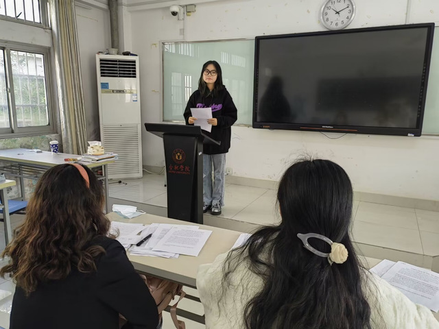 11月5日上午八點(diǎn)三十分,外國(guó)語(yǔ)學(xué)院第十八屆英語(yǔ)風(fēng)采演講大賽初賽分別在一期八棟204、205、206教室順利舉行。出席本次比賽的評(píng)委是“外研社·國(guó)才杯”全國(guó)英語(yǔ)寫(xiě)作大賽省一等獎(jiǎng)、閱讀大賽省二等獎(jiǎng)獲得者孟琦、2022年創(chuàng)趣杯英語(yǔ)朗誦大賽冠軍羅郁、2021年創(chuàng)趣杯英語(yǔ)朗誦大賽冠軍潘菲、第十七屆英語(yǔ)風(fēng)采大賽優(yōu)秀獎(jiǎng)獲得者尹康凡、2022年創(chuàng)趣杯朗誦大賽三等獎(jiǎng)獲得者胡宇喆以及第十七屆英語(yǔ)風(fēng)采演講大賽策劃者朱燕妮。