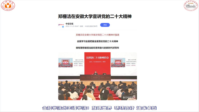 青年強(qiáng),則國(guó)家強(qiáng)。當(dāng)代中國(guó)青年生逢其時(shí),施展才干的舞臺(tái)無(wú)比廣闊,實(shí)現(xiàn)夢(mèng)想的前景無(wú)比光明。為了讓所有學(xué)生通過(guò)黨的二十大精神的學(xué)習(xí),認(rèn)識(shí)到自己的光榮使命,努力成長(zhǎng)為德智體美勞全面發(fā)展的社會(huì)主義建設(shè)者和接班人,外國(guó)語(yǔ)學(xué)院通過(guò)線上、線下和主題班會(huì)等形式,在全體學(xué)生中宣講黨的二十大精神